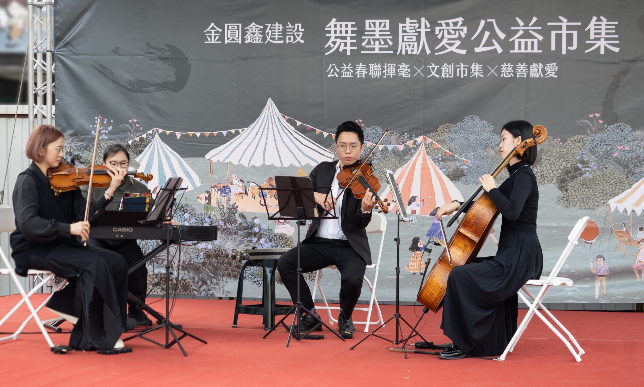 活動當天現場氣氛熱烈,年節將至,加上大師級春聯的獨特吸引力,使買氣高漲,整個市集充滿小錢做大愛的善意響應。除了公益義賣外,金圓鑫文創市集更是一大亮點,現場設置了跨世代皆喜愛的各式攤商,並邀請弦樂團進行現場表演,營造冬季遊樂園般的歡樂氛圍。兒童氣墊樂園、釣魚遊戲等童趣活動讓孩子們玩得不亦樂乎,而眾多美食攤位前更是人潮絡繹不絕,充分展現金圓鑫建設在地的品牌號召力與影響力。